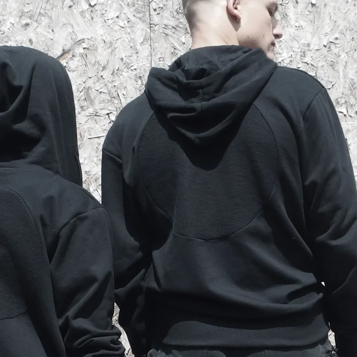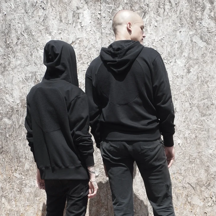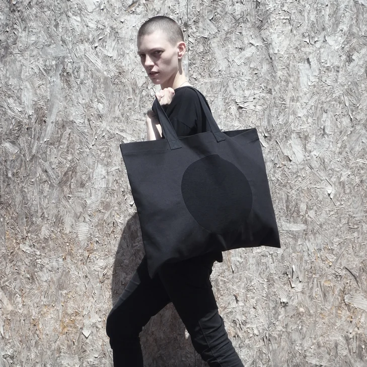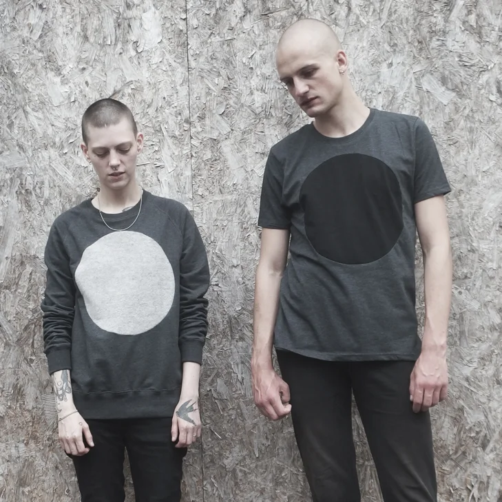 Inspired by the varying shades of grey and black visible on the moon, the monochromatic collection of t-shirts, hoodies, bags and accessories features a muted palette of solid black, heather grey, and solid grey fabrics.