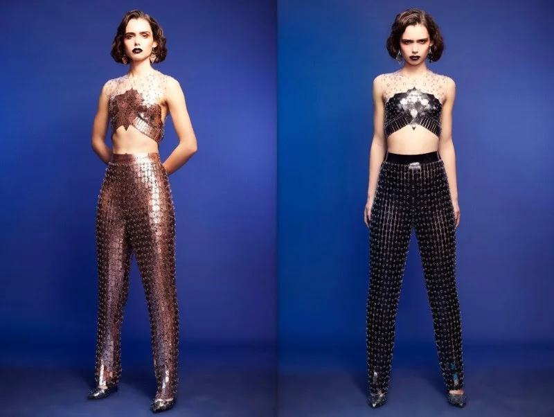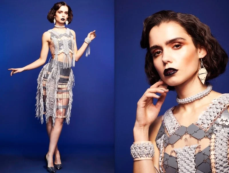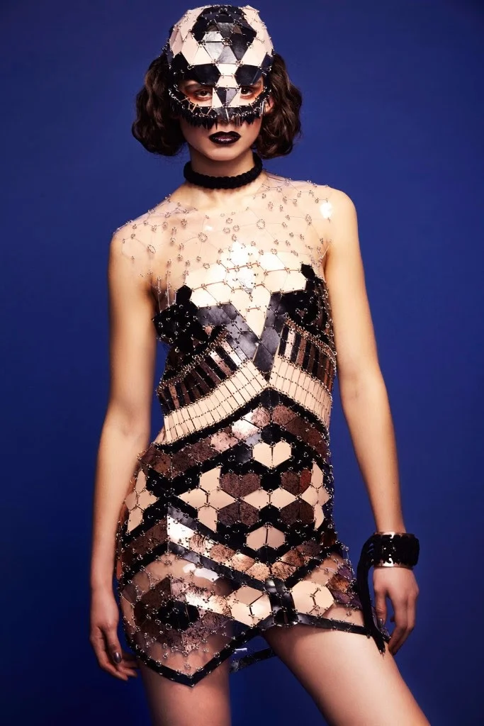 For her AW16 collection she explores the intersection of textures and their effect on the female form. The colour palette is inspired by the oxidisation of metalics – juxtaposing traditional copper, pewter and nudes through shades of rich turquoise and jade. These are presented with stark black pieces that give a confident contrast to this sculpted look.
