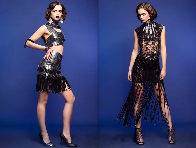 Key textures are seen on signature dresses cut from PVC panelling and leather, intersected with delicate chain link details, macramé knotting and finished with an abundance of fringing throughout.