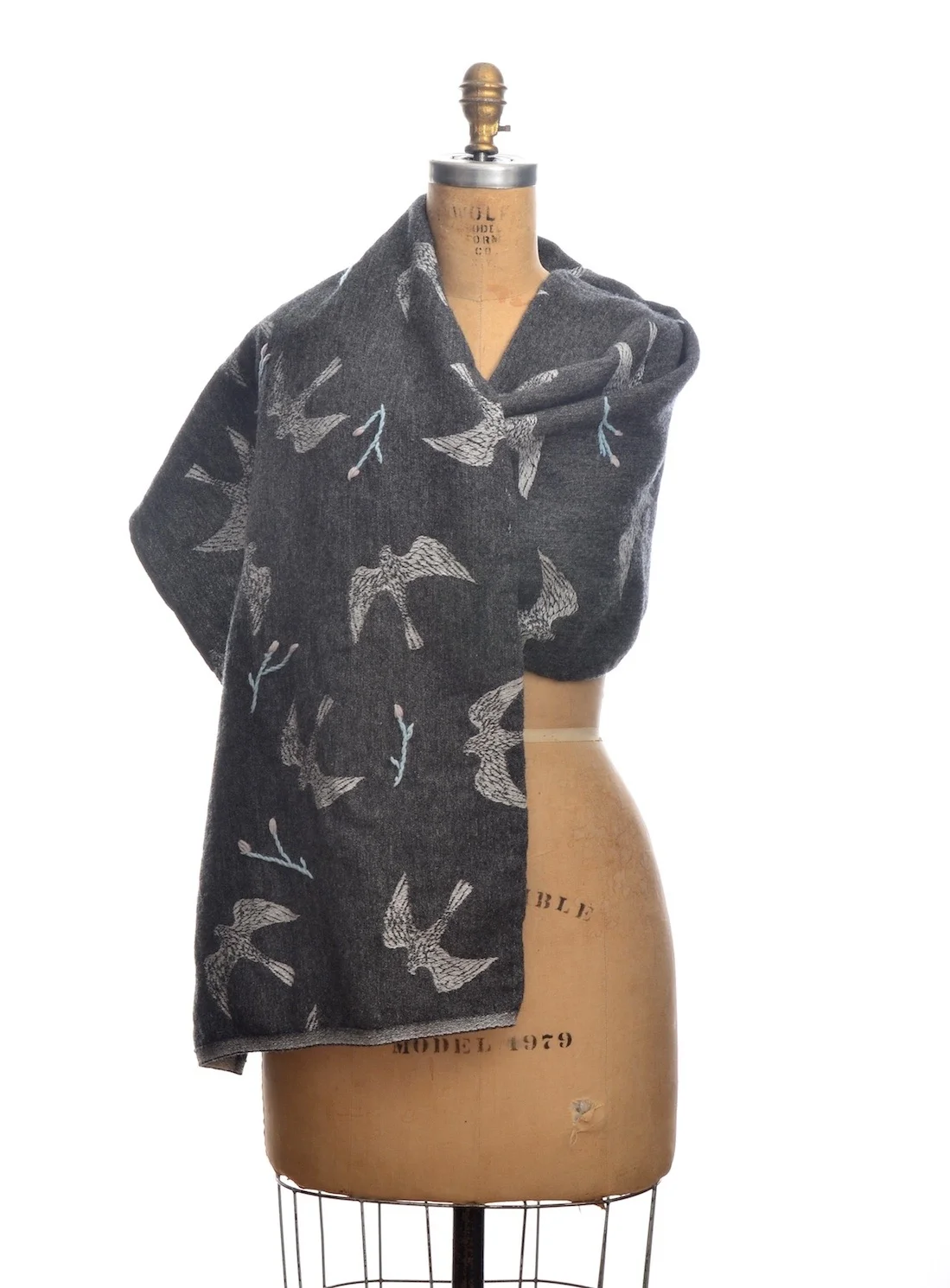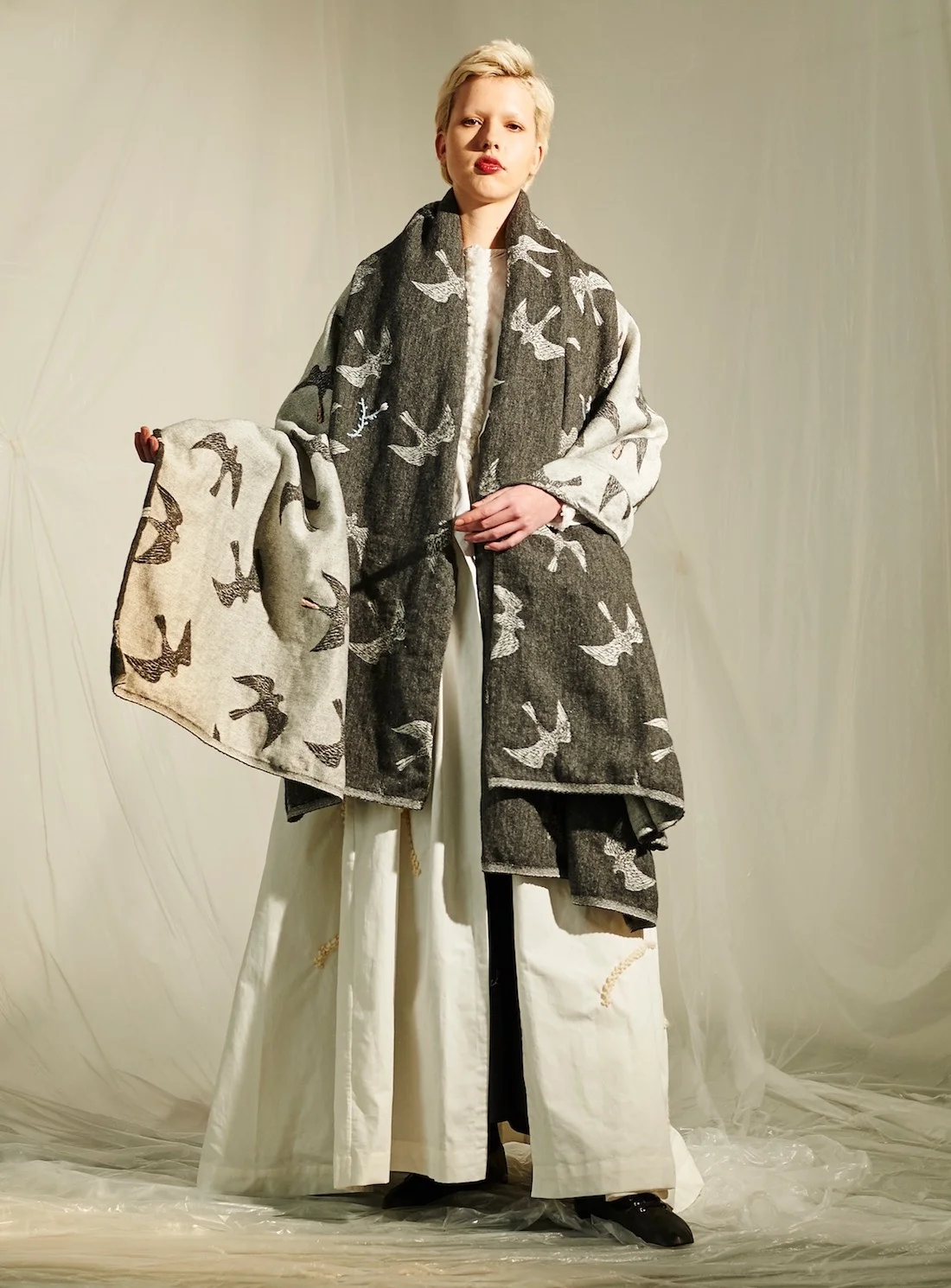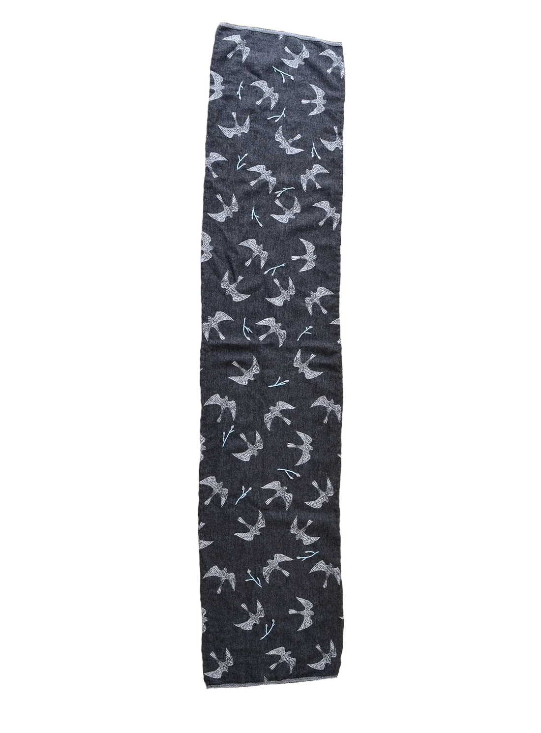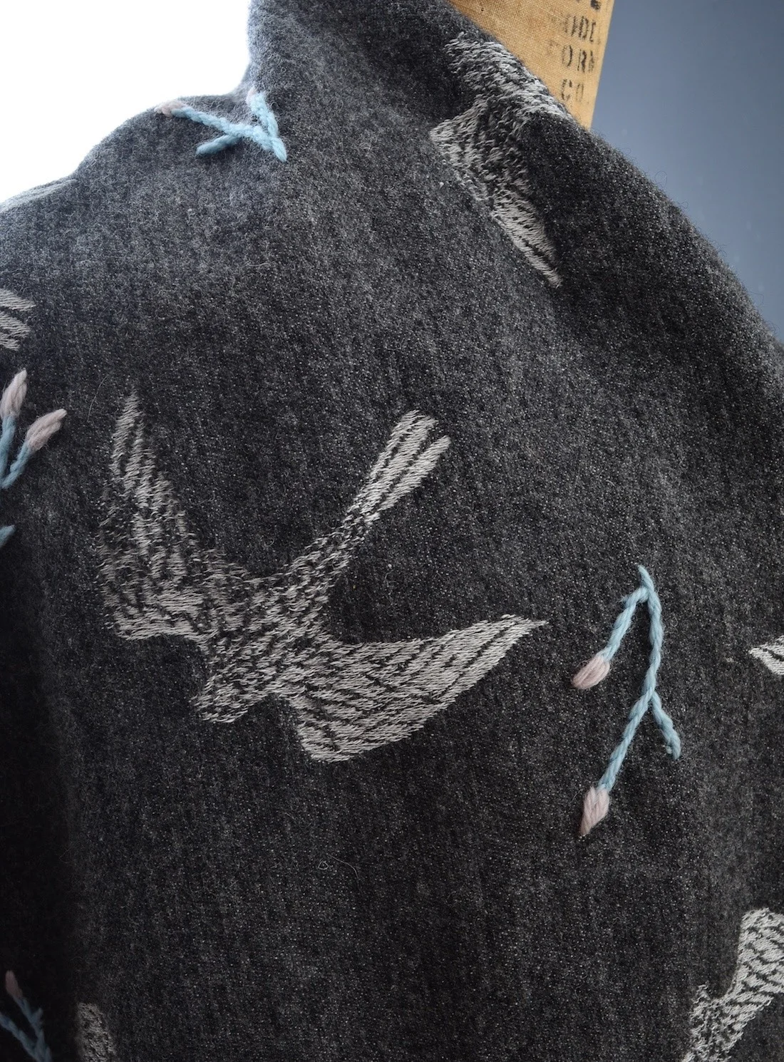 Just take a look at this treasure. A gloriously huge wrap of soaring swallows interspersed with floral hand embroidery in charcoal grey wool. This is the oversized Grey Embroidered Swallows & Flora Scarf by Renli Su available on YBD. Dark grey front with contrast lighter reverse. It measures a whopping 440cm x 45cm and is comprised of 100% organic wool sourced in Scotland. I love Renli Su.