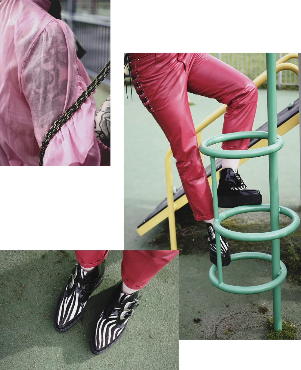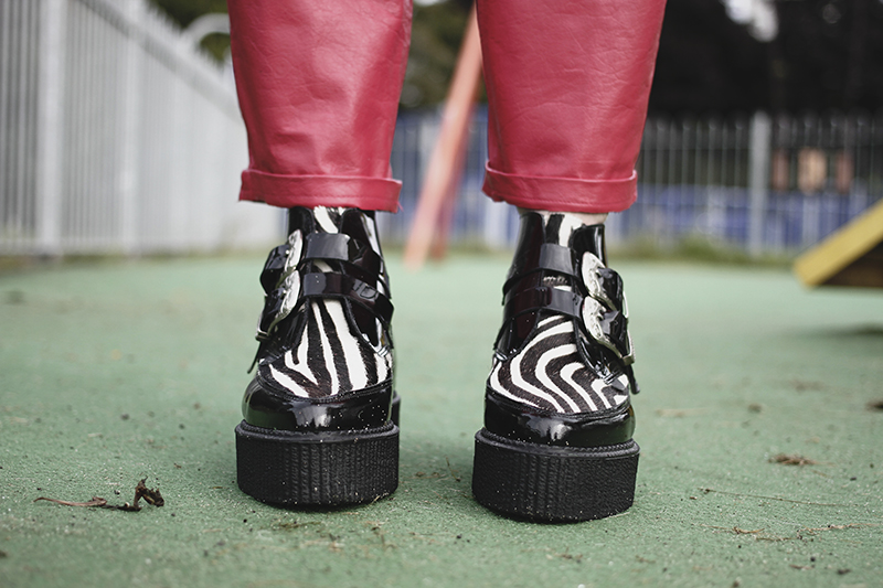 One outing of these bad boys and I had an admiring comment from a lady in Morrisons immediately! The mixture of zebra apron with the patent leather is really rather spectacular, if I don't say so myself. I am already au fait with the comfort of Bowie boots, having owned a plain black pair for many years now, but this is my first time with a double sole on this particular model, and of course my first time investigating their patent leather. It doesn't disappoint. In the punk spirit of the boots, I got Dust to add in some lace up detailing on a pair of vintage leather trousers which were too small for me. Needless to say, the lace up sides make them precisely 600 times better.