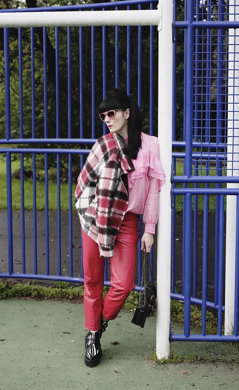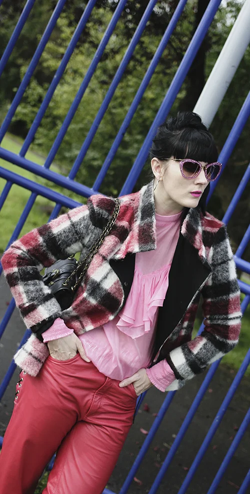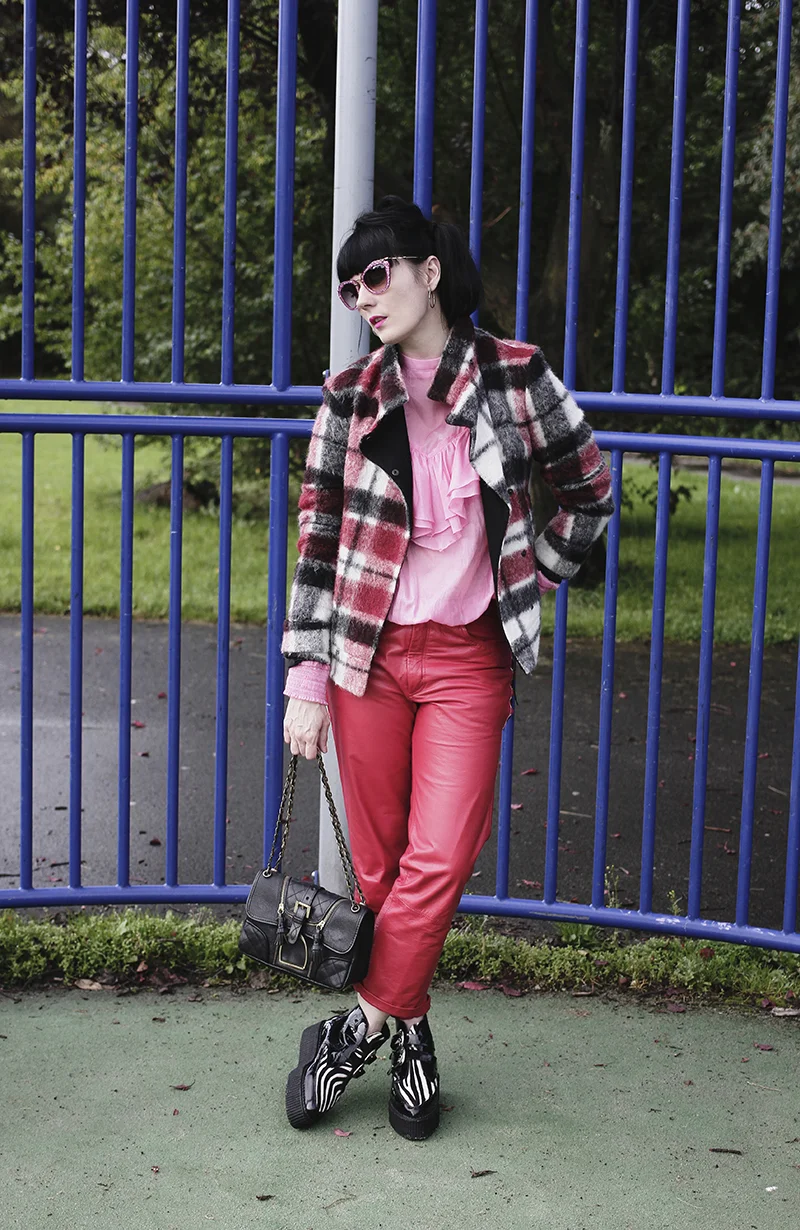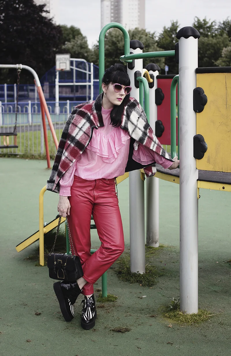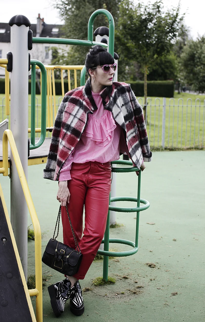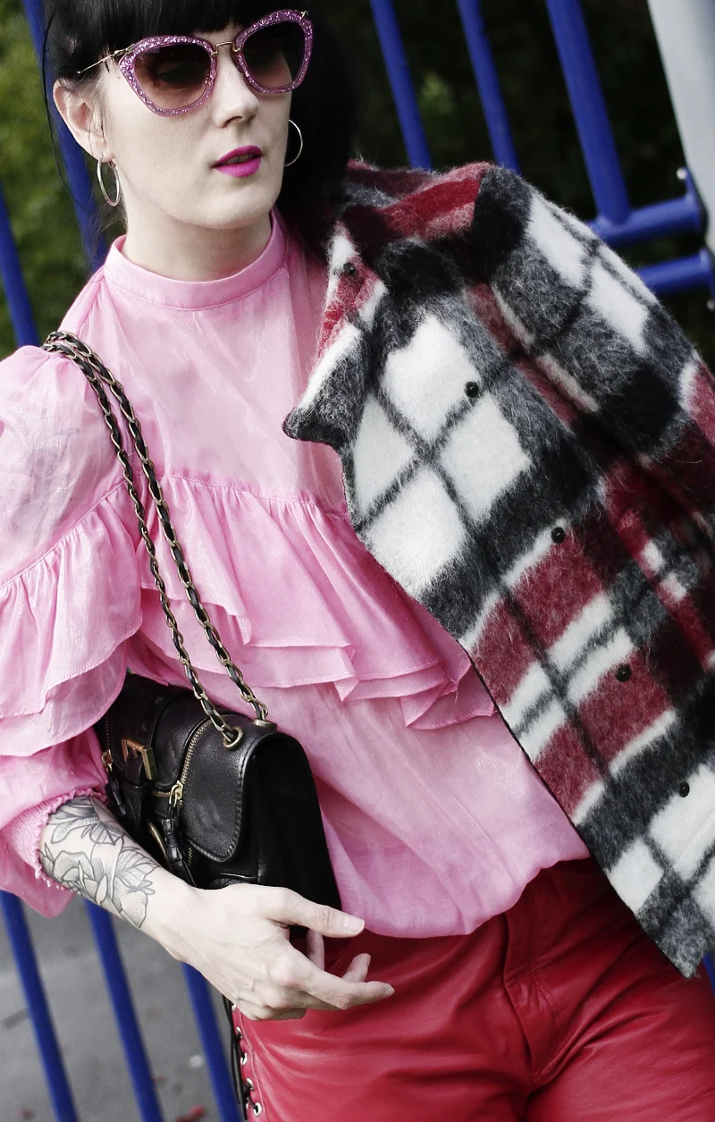 Underground England boots; Zara jacket: Sister Jane blouse; Vintage leather trousers; Luella bag; Miu Miu sunglasses