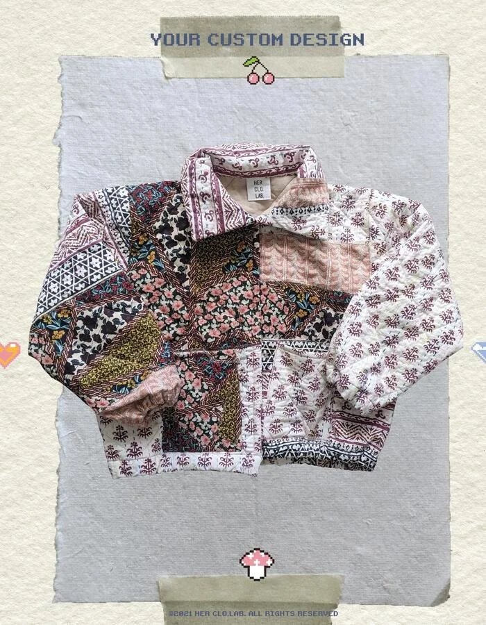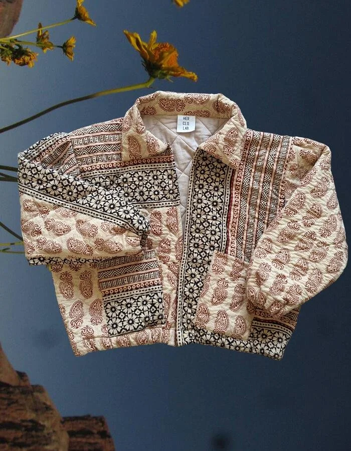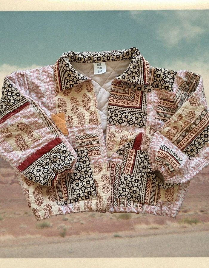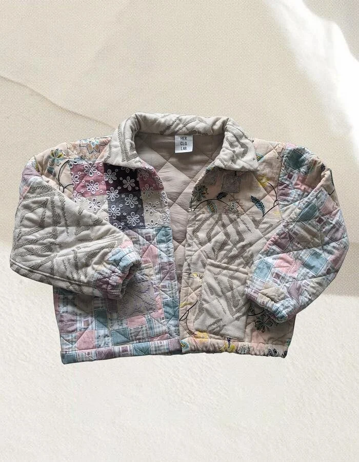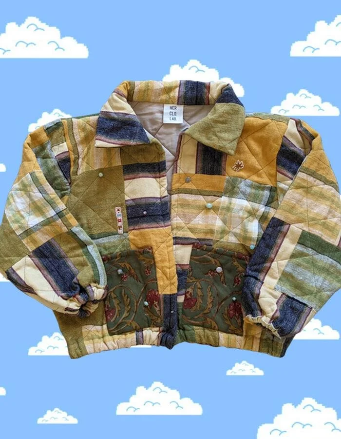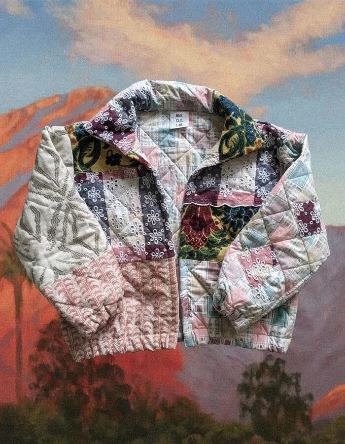 Oh how I love a quilted jacket. I have a real weakness for them. I don’t mean the nylon, puffy kind, but rather the quilted blanket style. I have two in my wardrobe and I love both. These patchwork pelageya bombers, made from remnant and vintage fabrics, with recycled wadding by from Her Clo. Lab though takes it to another wonderful level. Little House on the Prairie for the 21st century.