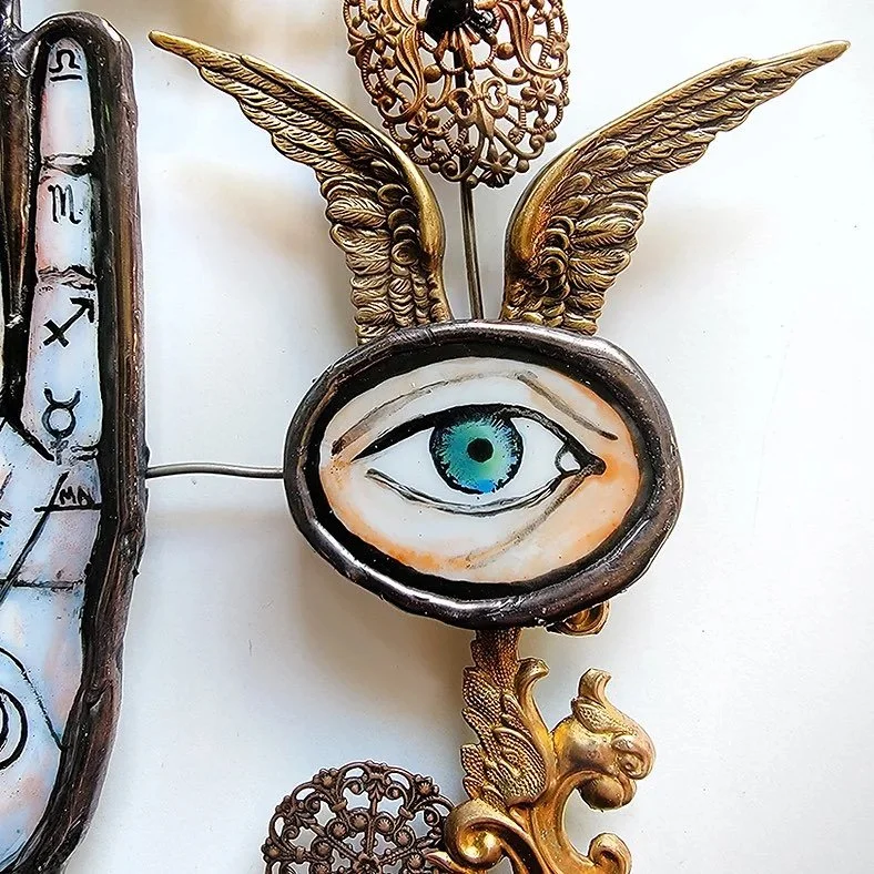 As well as larger pieces she creates ‘ Petite Art’ like the Prince of Pumpkins below. These are tiny affordable works for wall and window. It goes without saying that I was also thinking about popping one onto leather cord and wearing it round my neck…